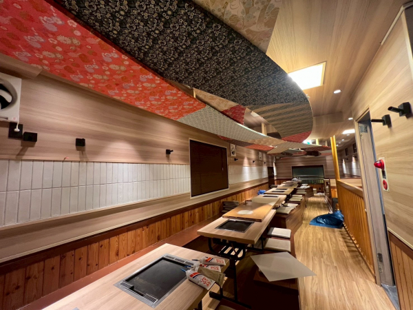 もんじゃ焼き屋の内装工事がついに完成しました。今回は、“和と温かみ”をテーマに、日本の伝統文化である着物の柄や質感を内装に取り入れた特別な空間づくりを実現。壁面や装飾に施した着物生地が、店内に華やかさと落ち着きを演出し、もんじゃ焼きを囲む時間をより豊かにしています。木の温もりと柔らかな照明が調和した店内は、訪れる人すべてが心地よく過ごせる、温かみあふれる空間に仕上がりました。